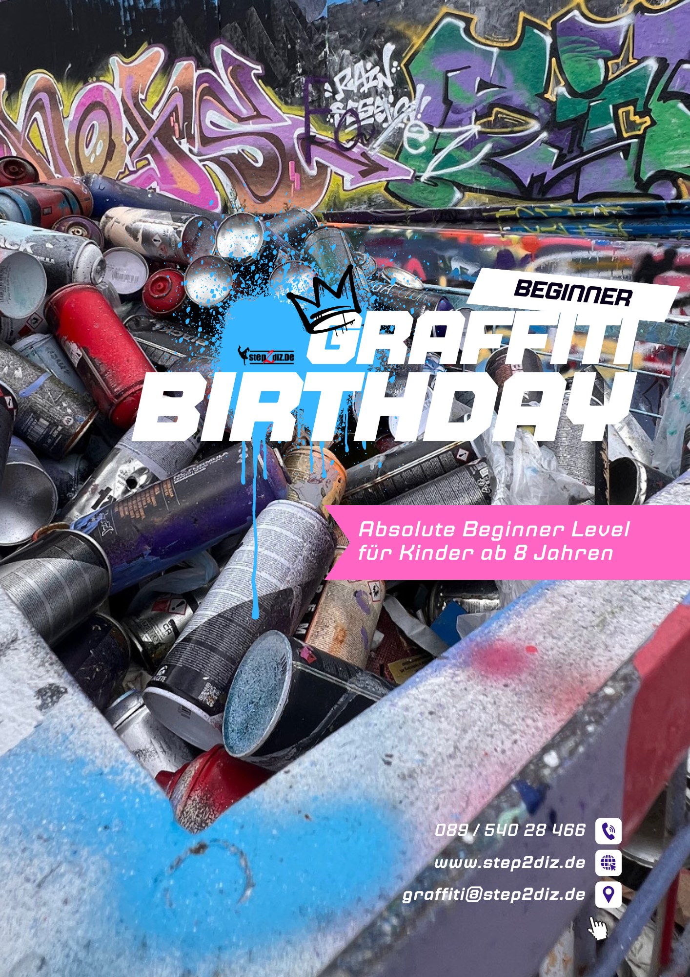 Jetzt Wunschtermin HIER oder auf graffiti@step2diz.de anfragen und einen unvergesslichen Graffiti-Kindergeburtstag im Tanzstudio feiern.