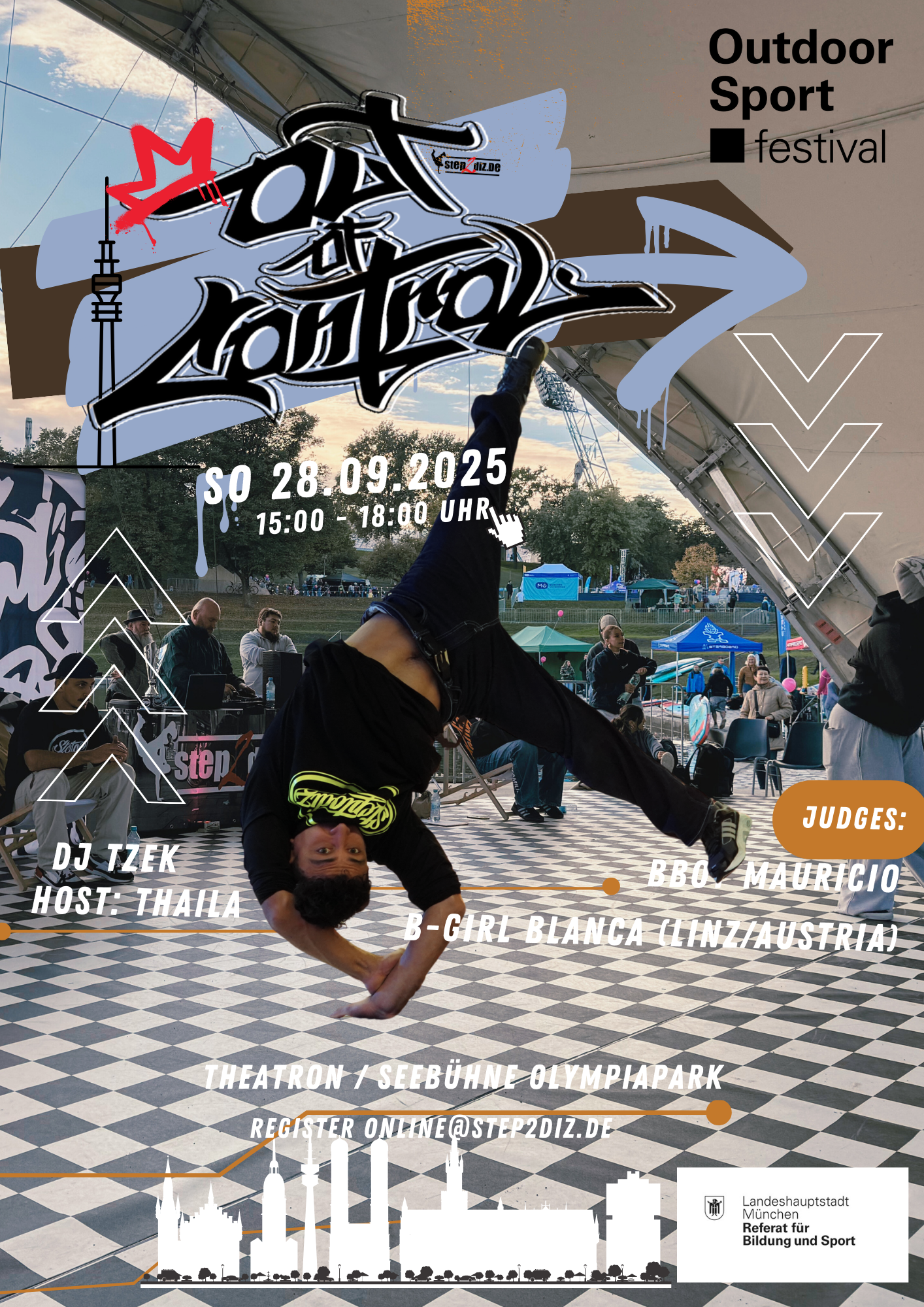 Am Sonntag, den 28. September, erwartet euch auf der Seebühne im Olympiapark München ein ganz besonderes Highlight: das Out of Control Breakdance Battle in Kooperation mit dem Sportamt München und dem Outdoorsportfestival.