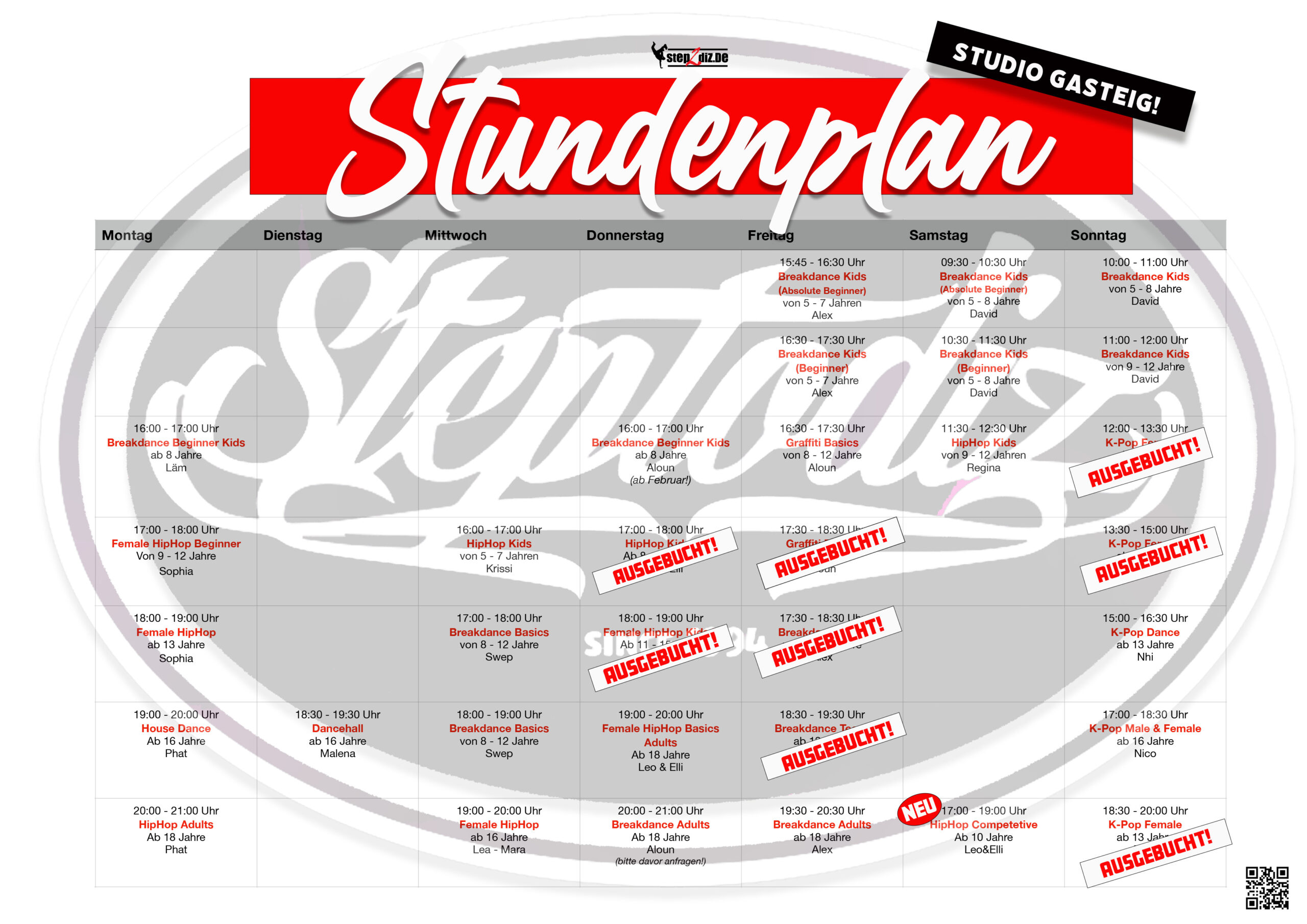 Hier findest du unseren aktuellen Stundenplan für beide Studios.